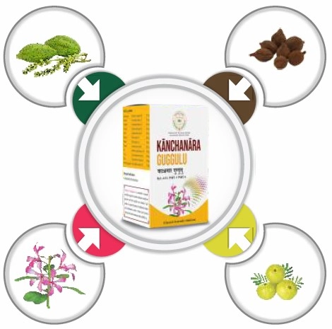 Kanchanara Tvak (Bauhinia variegata, Bk) 40 parts, Haritaki (Terminalia chebula, Fr), Vibhitaki (Terminalia bellirica, Fr), Amalaki (Emblica officinalis, Fr) 8 parts each, Shunti (Zingiber officinale, Rz), Maricha (Piper nigrum, Fr), Pippali (Piper longum, Fr), Varuna (Crataeva nurvala, Bk) 4 parts each, Ela (Elettaria cardamomum, Sd), Tvak (Cinnamomum zeylanica, Bk), Patra (Cinnamomum tamala, Lf) 1 part each and Shuddha Guggulu (Commiphora mukul) 83 parts.